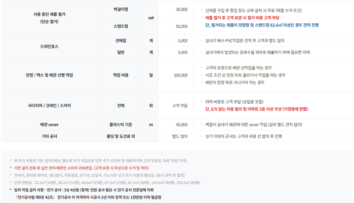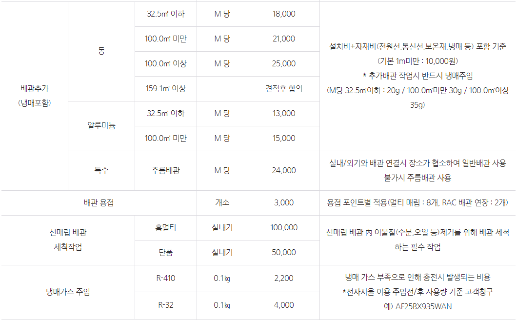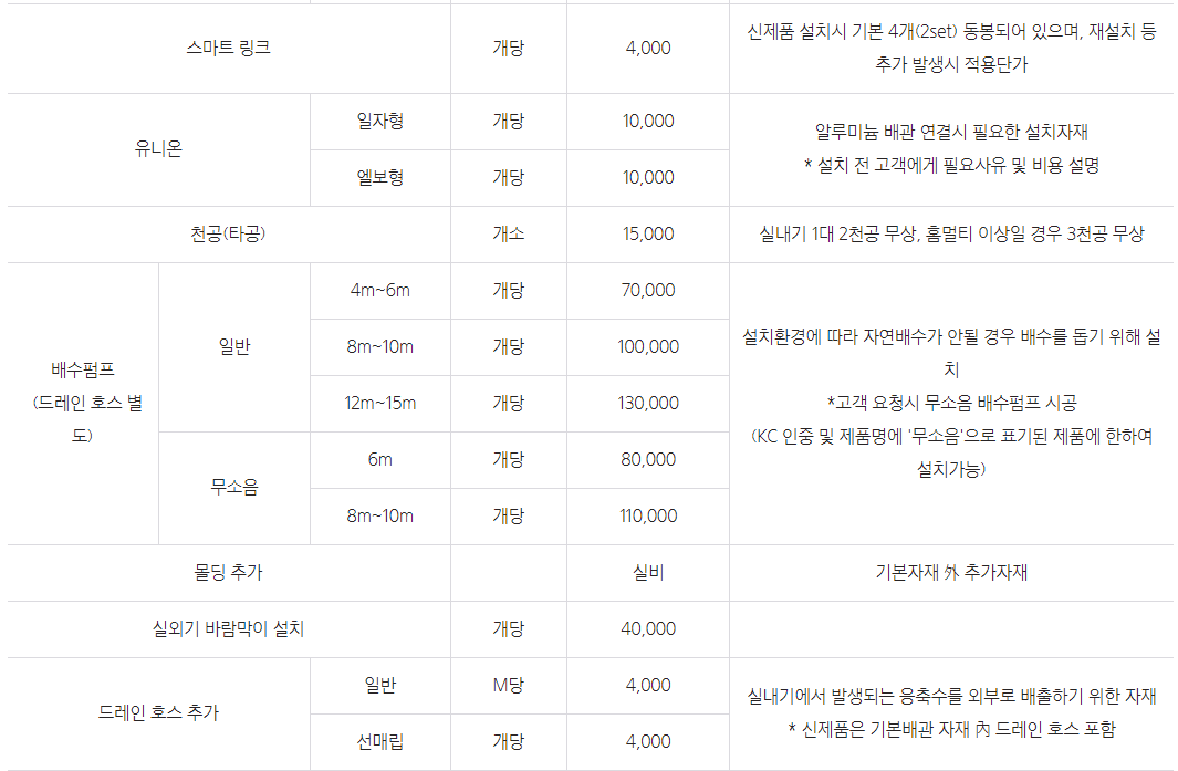 냉방 전용 배관 추가시 미터당 13,000원 / 냉난방 배관 추가시 미터당 15,000원드레인