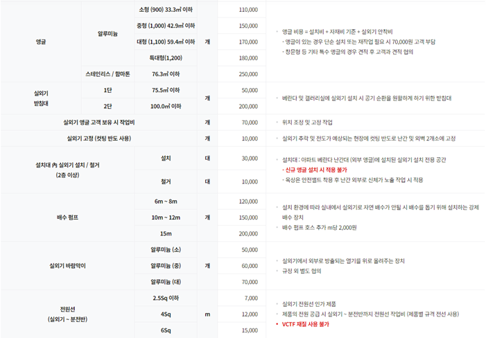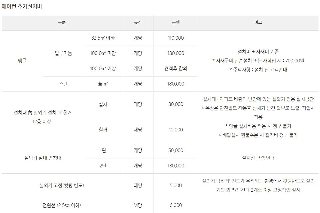알루미늄 앵글 보유시 6~7만원 미보유 10만원2층이상 3만원 8층이상 층별 5000원식 추가에어컨실내기 높이 2미터 이상 설치시 추가 미터당 1만원