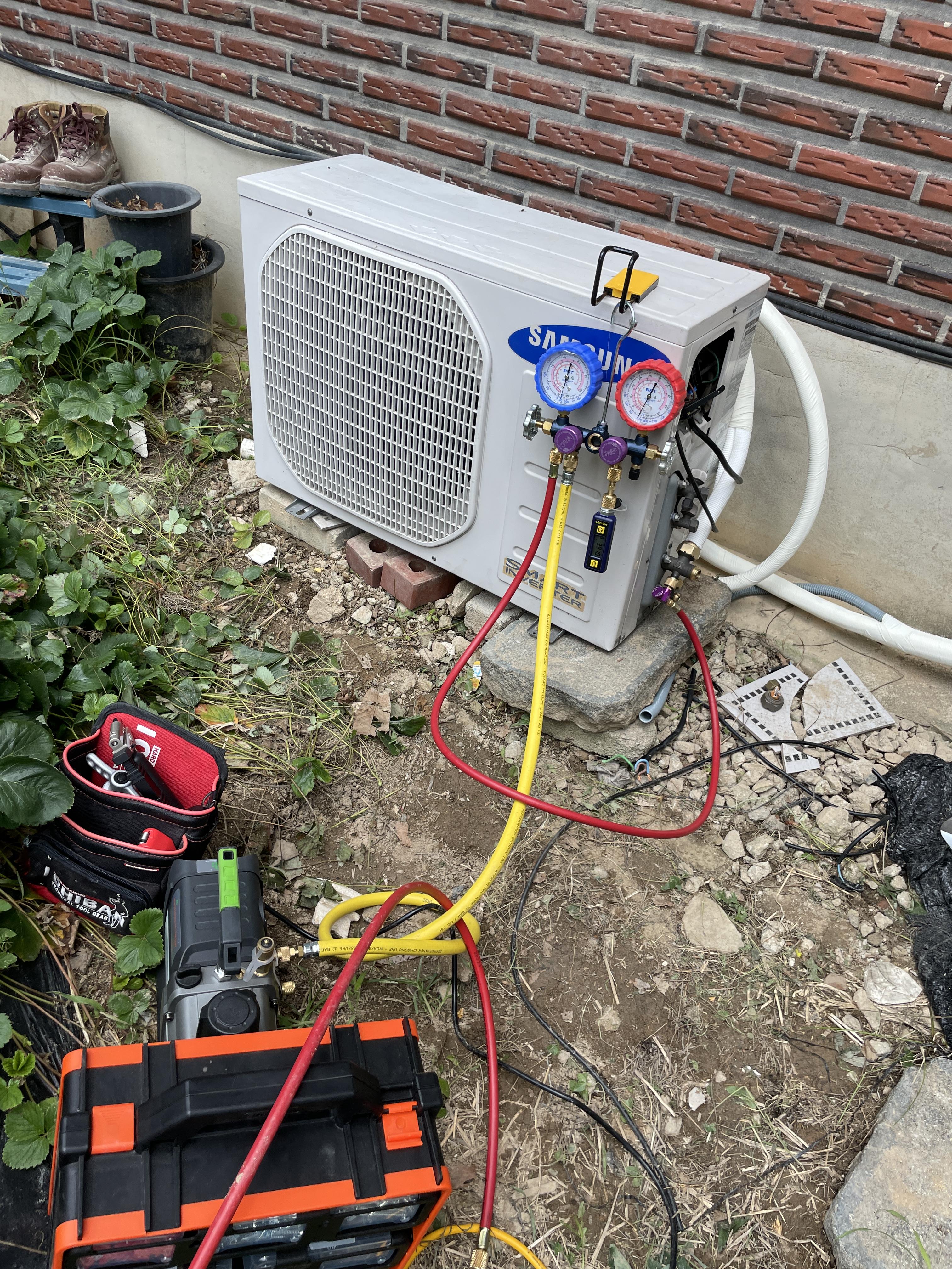에어컨 설치 시 진공작업을 안 하고 냉매로 밀어주는(에어퍼지) 경우가 많습니다.