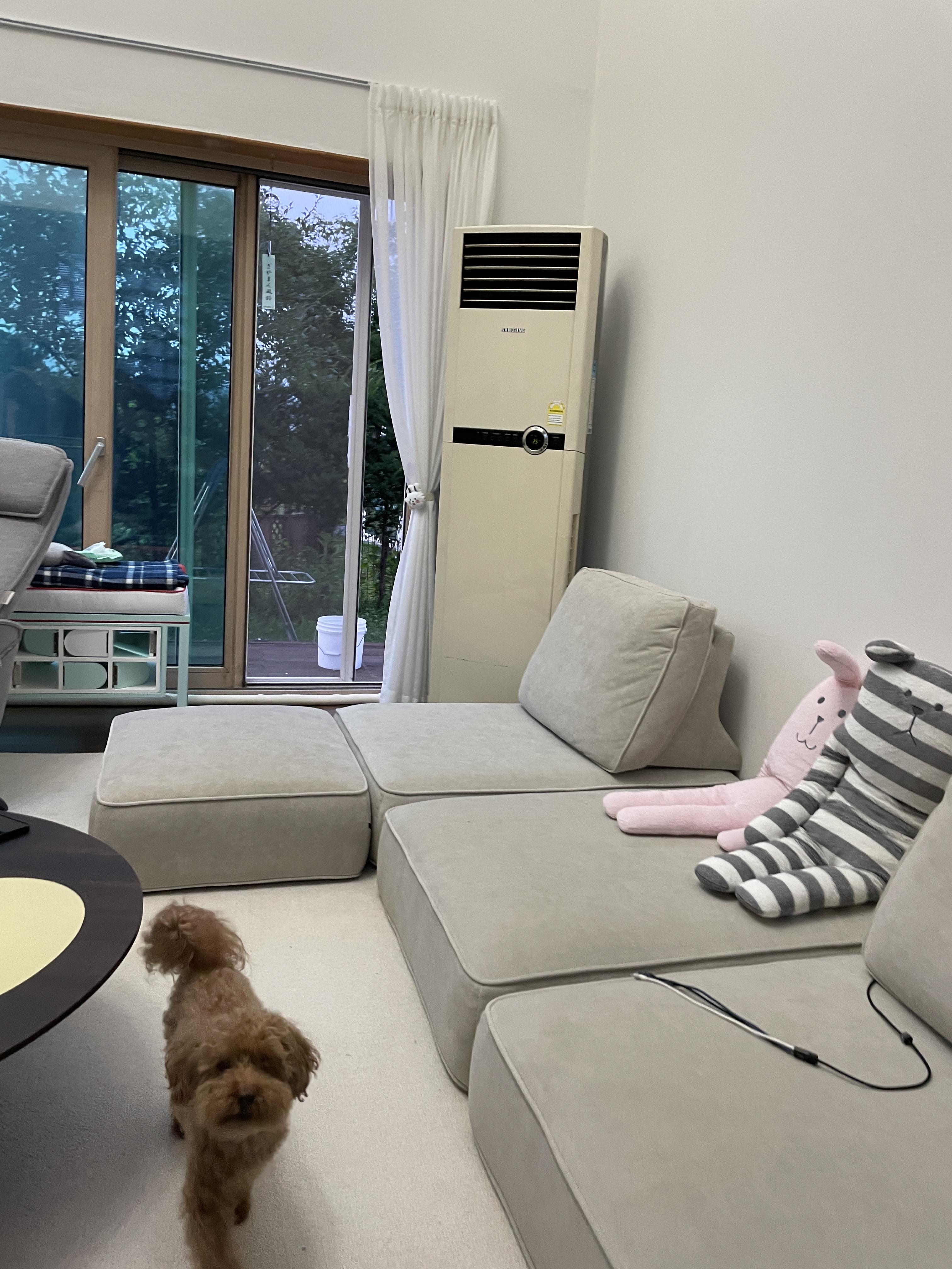 에어컨 설치를 위해 이동시켰던 소파를 원위치시키고...